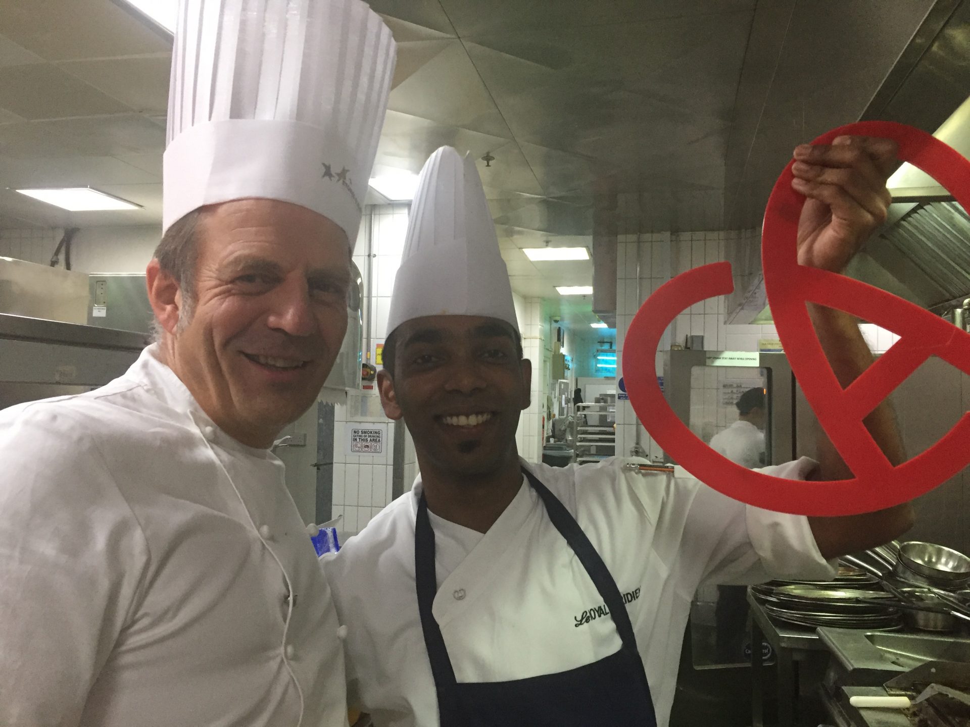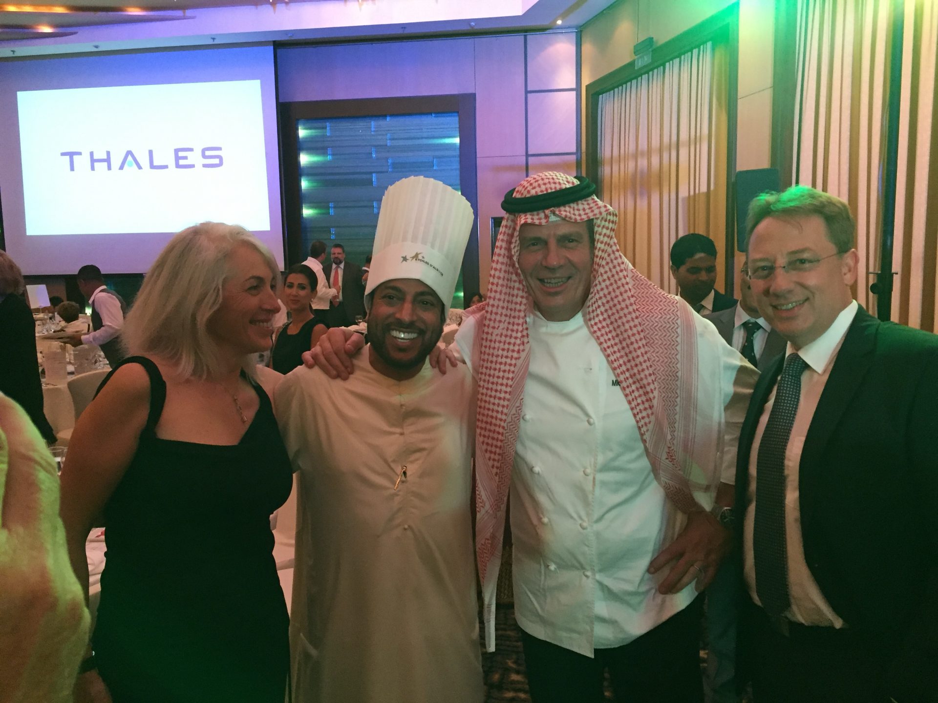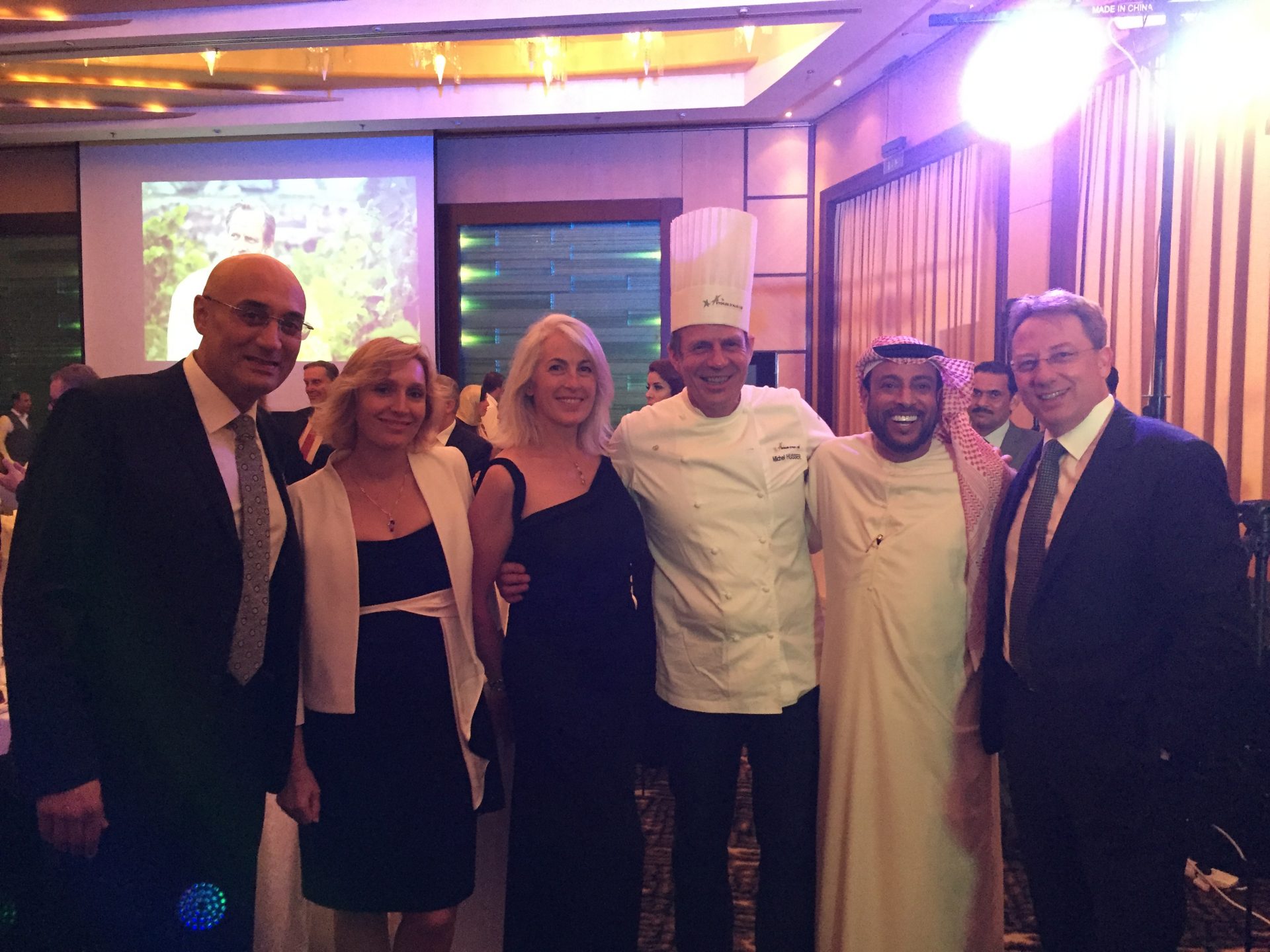 Le dîner se déroulait au Royal Méridien et nous avons été bien accueillis : les produits nécessaires demandés avant notre départ étaient approvisionnés et nous avons pu procéder à la mise en place dès le lendemain de notre arrivée.  Durant ces 3 jours de préparatifs nous avons eu la chance de travailler avec des collaborateurs très cosmopolites : jordanien, sri lankais, indien…. Décidément le langage de la cuisine est universel !