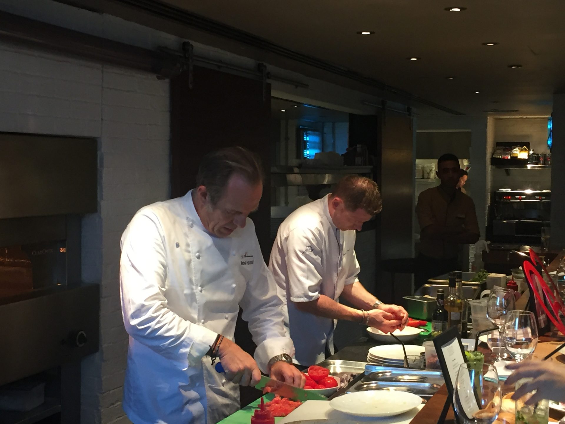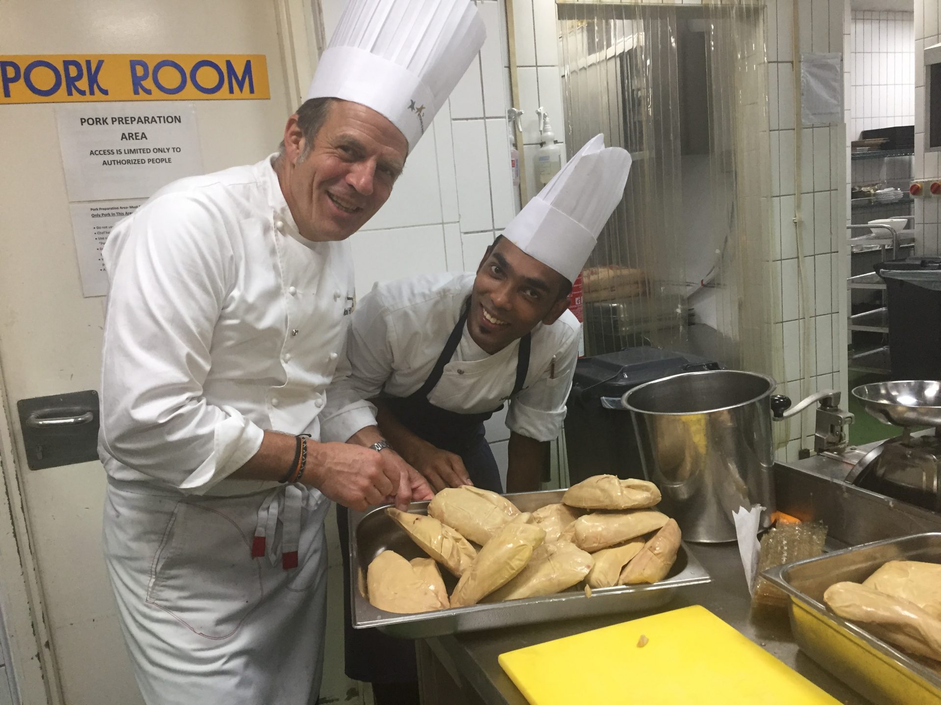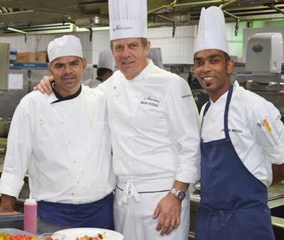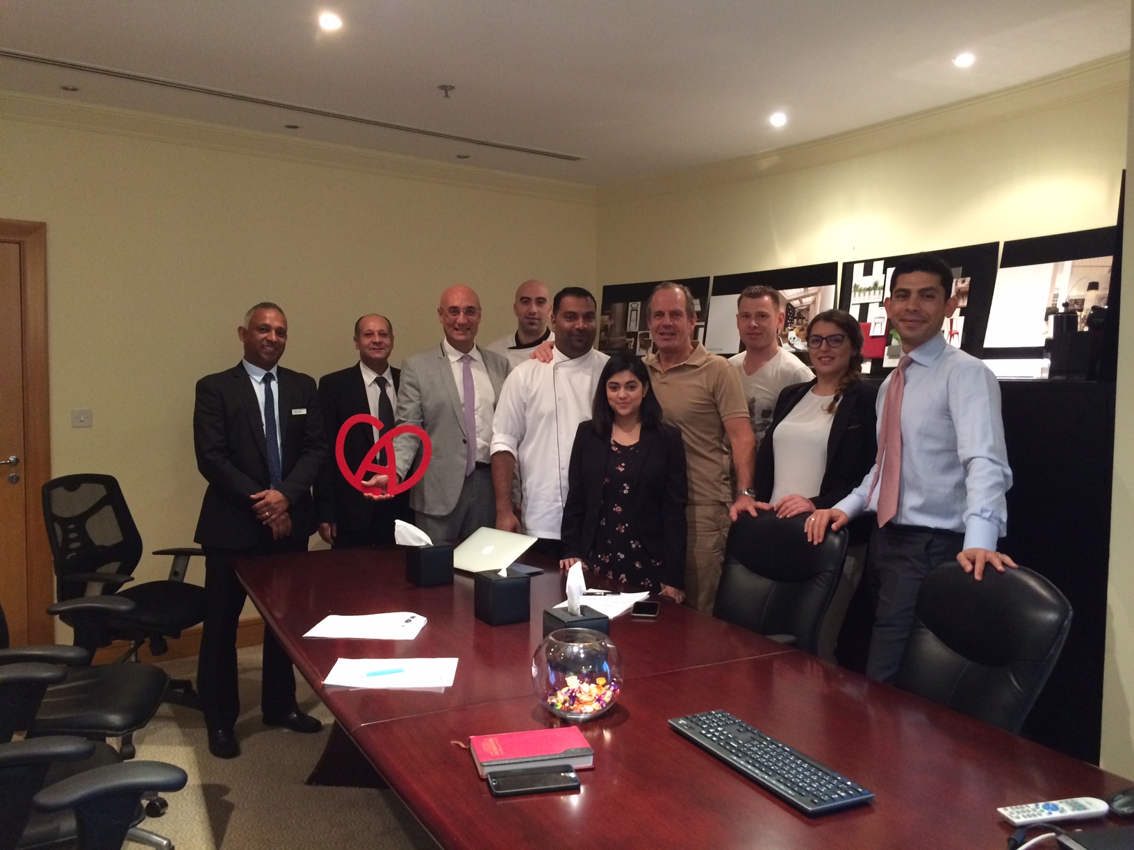 Le dîner se déroulait au Royal Méridien et nous avons été bien accueillis : les produits nécessaires demandés avant notre départ étaient approvisionnés et nous avons pu procéder à la mise en place dès le lendemain de notre arrivée.  Durant ces 3 jours de préparatifs nous avons eu la chance de travailler avec des collaborateurs très cosmopolites : jordanien, sri lankais, indien…. Décidément le langage de la cuisine est universel !