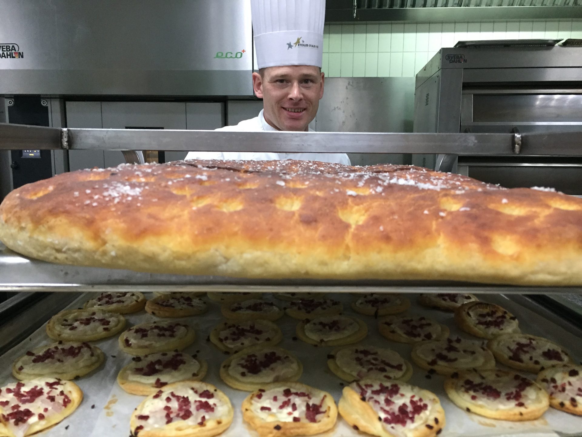 Mini-tartes flambées, Samossas choucroute et gambas, Remoulade de truite fumée pour l’apéritif. Presskopf de foie gras et queue de bœuf, ketchup à l’alsacienne pour l’entrée et suivie par un Filet de cannette caramélisé aux épices de pain d’épices, kougelhopf aux fruits secs.