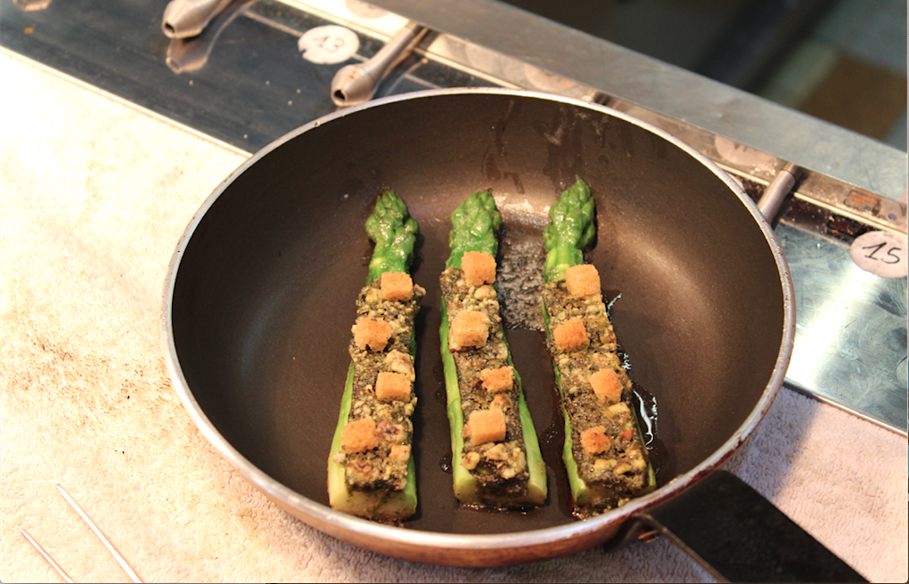 Cette recette est un vrai spectacle ! L’équipe de salle apporte la vessie de la taille d’un ballon de foot à votre table et la perce délicatement. Les techniques anciennes pour ce mets sont adaptées aux techniques modernes avec la cuisson basse température et la garniture. Les premières asperges vertes sont délicieuses. « J’aime autant manger ce plat de terroir que le cuisiner. Le moelleux de la volaille est incomparable et la sauce fait tout le reste. »